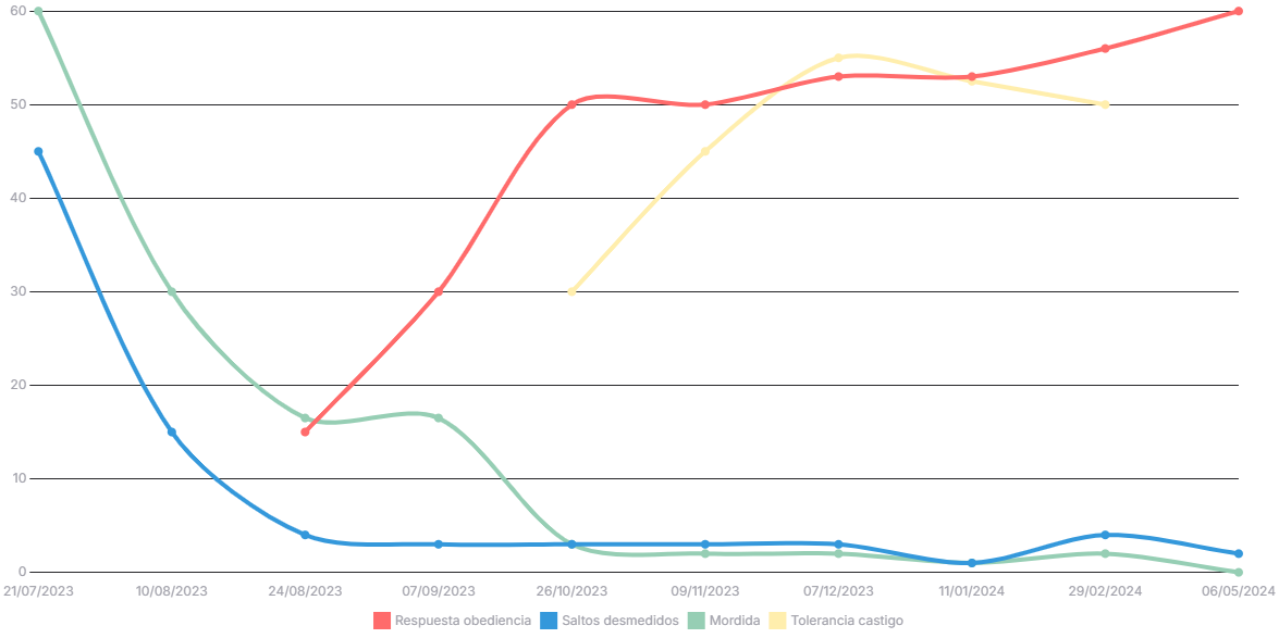 Podrán observar que un mes después de empezar el tratamiento (20/08/2023) la tasa de mordidas y saltos comenzaron a bajar notablemente. Y no solo eso, sino que también favoreció en el aumento progresivo de su atención hacia mi, la respuesta a los comandos de obediencia y la tolerancia a la frustración.